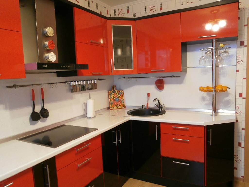 при оформлении пространства стоит использовать максимум три цвета, чтобы не отвлекать внимание от основной идеи и не перегружать помещение; обои, кухонный гарнитур и предметы обстановки должны быть разных цветов или хотя бы разных оттенков одного цвета, в противном случае они будут сливаться друг с другом; пол и потолок следует делать разного тона; цвет для столешницы и фартука должен отличаться от цвета остальных предметов мебели; стены и кухонный гарнитур должны контрастировать друг с другом, мебель также должна отличаться по цвету от штор и другого текстиля. Яркий дизайн кухни подходит как большим по площади, так и компактным помещениям