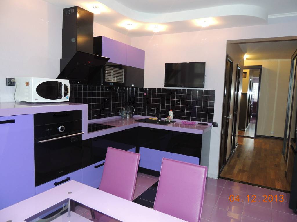 В современном оформлении кухни позволяется задействовать насыщенные, яркие цвета с контрастными комбинациями лимонно-жёлтого цвета или же с холодными оттенками в сочетании с насыщенным фиолетовым или зеленым цветом деталей интерьера.