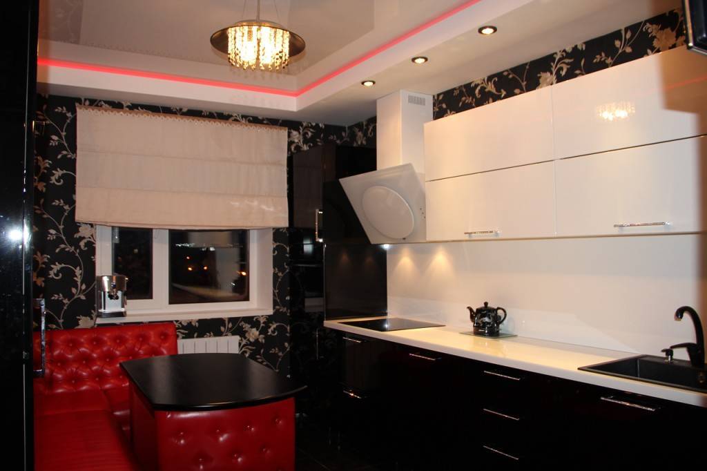 Если же Вы отдаете предпочтение белой мебели на кухне, то необходимо выбрать более темные тона для пола или потолка.