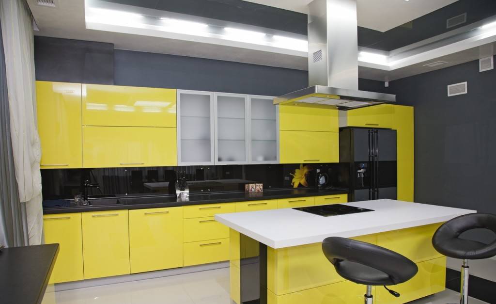 Кухня с глянцевыми жёлтыми фасадами и чёрным фартуком