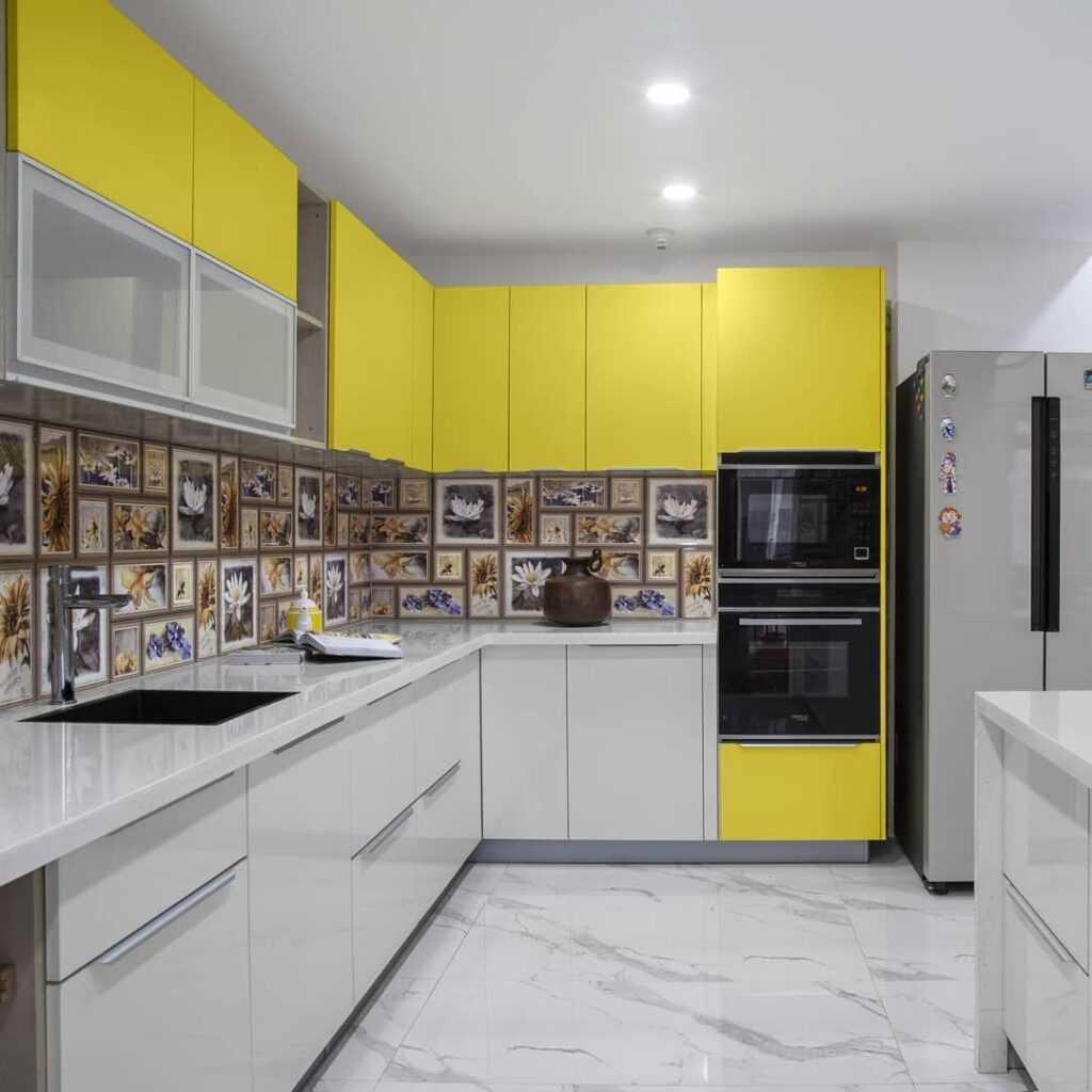 На фото желтый гарнитур без верхних шкафов в сочетании с серой отделкой в интерьере кухни в стиле минимализм.
