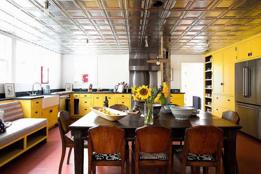 Если желтым вы решили сделать потолок, этот цвет нужно поддержать рисунком на обоях, желтой посудой, шторами или другими аксессуарами. Даже желтые стулья или чехлы на табуретах добавят гармонии и законченности в такой дизайн.