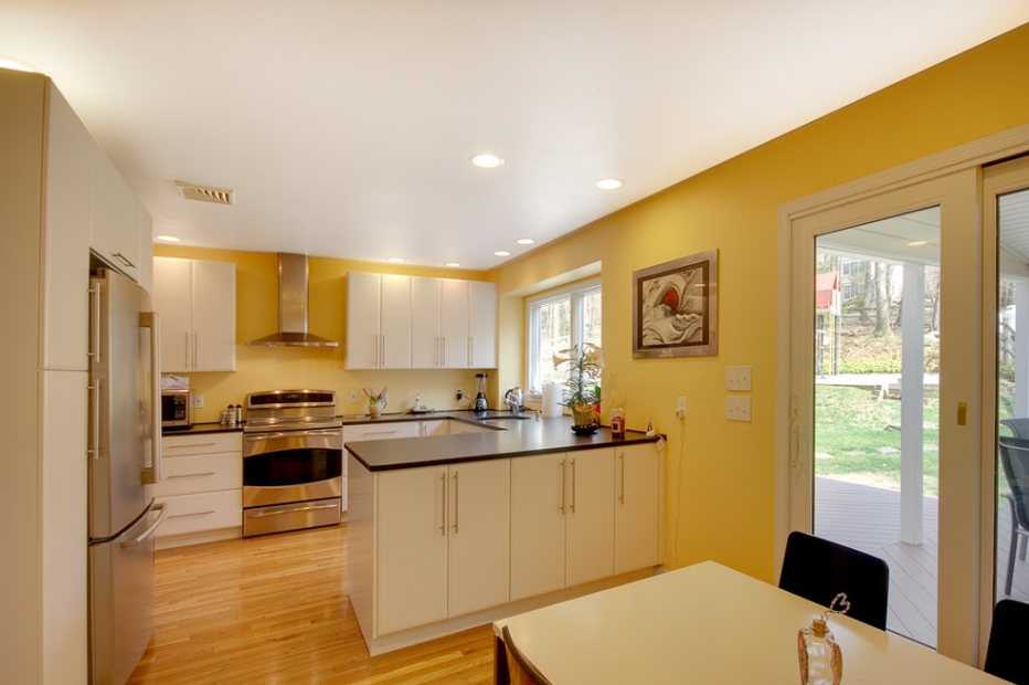 Желтые стены на кухне требуют осторожного выбора цвета мебели и прочих масштабных деталей интерьера. На этом фоне хорошо будут смотреться коричневый, серый, черный, белый, синий и зеленый