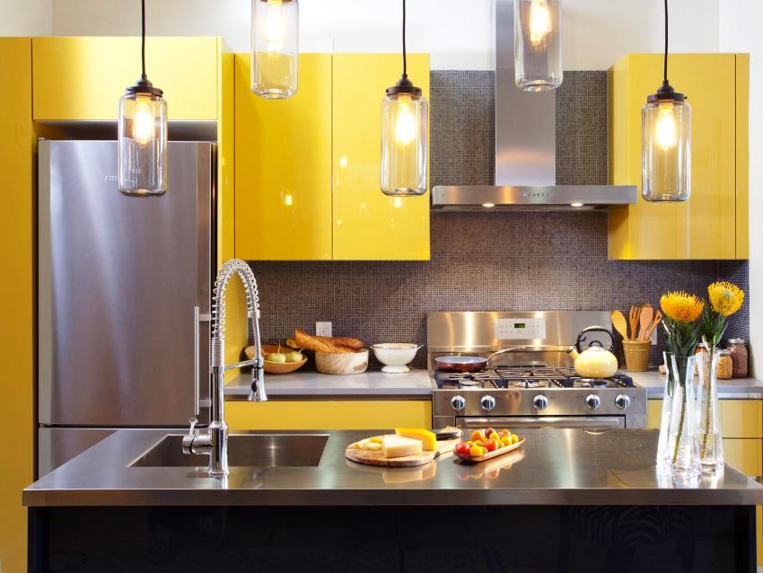 Кухни желтого цвета могут быть выполнены в разных стилях и из разных материалов.