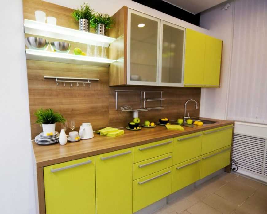 Лайм «дружит» со всеми оттенками желтого и зеленого, создавая веселую и жизнерадостную атмосферу в кухне