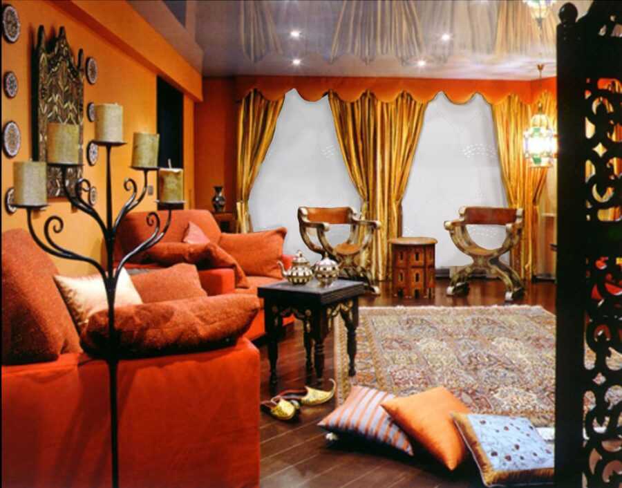 Гармонично будут смотреться многослойные портьеры из однотонной ткани и материала с узором. Рисунок или орнамент может перекликаться с другими предметами комнаты. Так же удачно будет смотреться однотонная вуаль или тюль в сочетании с портьерами с крупным рисунком.