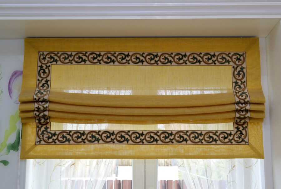 Цвет отделки этого декоративного элемента может приглушить общий желтый мотив штор, как это делает серый, или выделить, как могут, например, ярко синие ламбрекены.