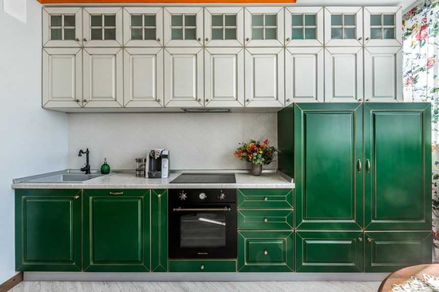 Для светлых помещений, где много естественного света больше всего подходит темно-зеленая кухня. А применение темных оттенков в небольшом помещении сделает его визуально меньше, а сама кухня будет мрачной.