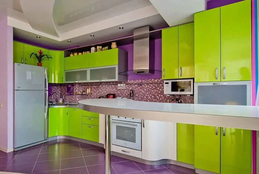 Зеленая палитра олицетворяет жизнь, энергию. В природе часто встречается комбинация сочного зеленого с желтым, потому такие краски будут гармонично смотреться в любом интерьере. В современном стиле часто используются яркие элементы в дизайне комнаты. Для обустройства кухни рекомендуются приятные изумрудные оттенки для летнего настроения в течение всего года.