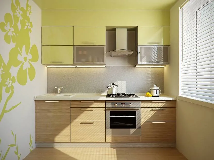 Одна стена будет вдоль себя располагать кухонный гарнитур, варочную поверхность, духовку и раковину. Для расположения холодильника выбирается другая стена. Обеденный стол маленькой кухни в этом случае перемещают к окну.