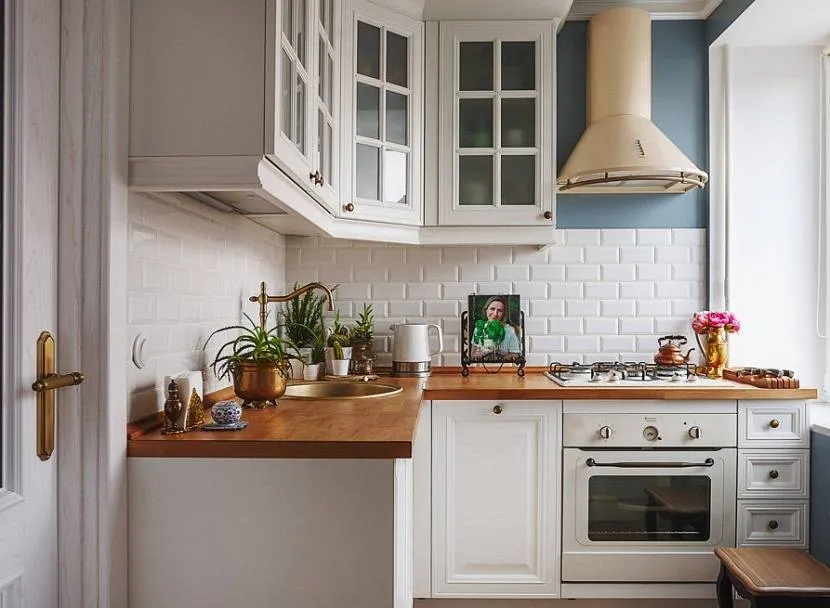 Расположение мебели Г-образным способом. Здесь используем две смежные стенки. Угловая кухня в этом случае расширяет рабочую зону и несколько видоизменяет форму маленькой кухни.