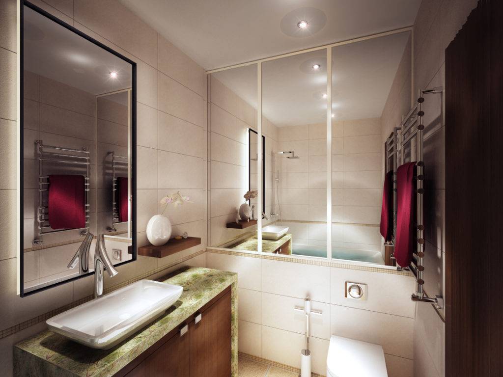 Зеркальная стена вместо привычного овала над раковиной – простое и удачное решение для ванной. Тем более, что эта комната, как правило, тоже нуждается и в дополнительном свете, и в пространстве.
