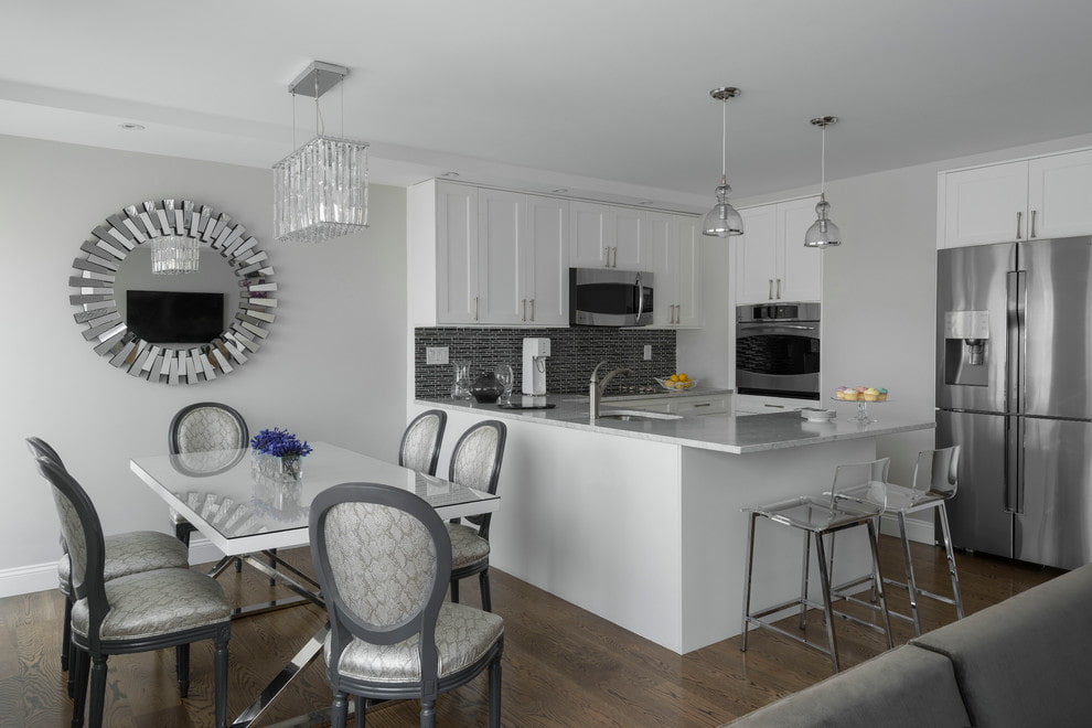 Отражающие зеркальные поверхности могут быть расположены в самых разных местах кухни. Самые популярные варианты: