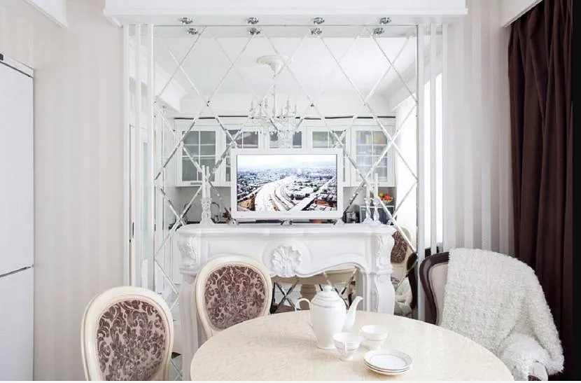 Придать торжественности столовой зоне можно с помощью габаритного зеркала, фигурного или небольшого изящного полотна расположенного над обеденным кухонным столом. Поверхность отделывают зеркальной плиткой или устанавливают светоотражающие вставки;