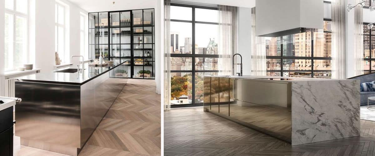 Если вы ищете элемент, который заставит вашу кухню сиять, выделиться на фоне соседей, сделайте ставку на зеркальный остров! Это чрезвычайно привлекательный элемент, который захватывает все внимание. Поместите в нее плиту и раковину и откройте пространство для гостиной