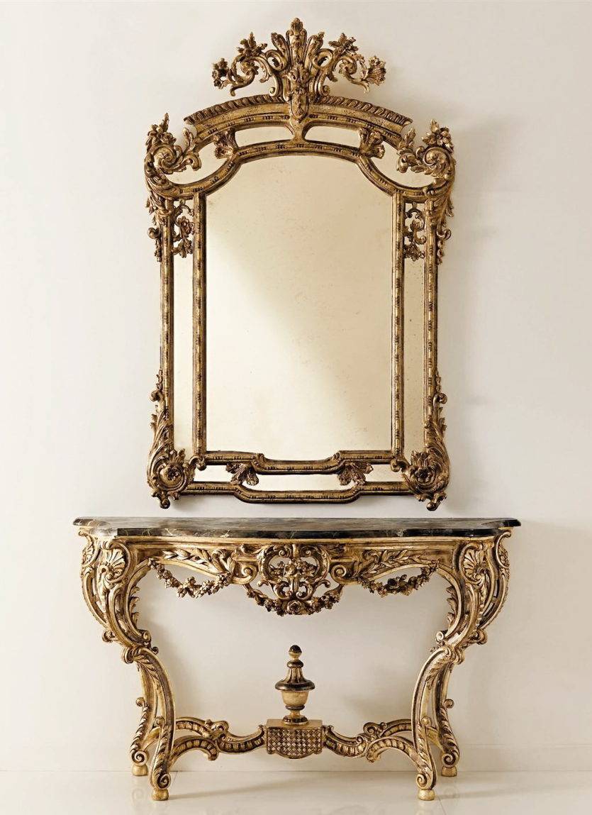 Здесь достаточно часто применяют большие или овальные зеркала в массивных рамах, украшенных лепниной, резьбой, позолотой или сложными узорами с мифологическими или растительными мотивами.