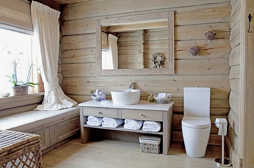 Стиль кантри в этом санузле проявился в использовании конных атрибутов для оформления пространства. Оригинальное исполнение рамы для зеркала, делает интерьер незабываемым, невероятно оригинальным.