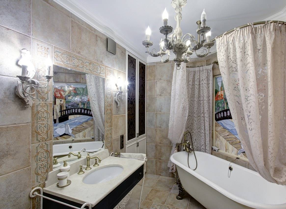Стиль, как барокко, шебби-шик и остальные направления дизайна, имитирующие дворцовую роскошь решения – приверженец помпезной роскоши, поэтому и дизайн зеркал выбрать в ванную в его исполнении нужно соответствующий. Аксессуары должны порадовать поистине царским обрамлением. Что может напомнить о дворцовом великолепии? Конечно же, лепные орнаменты, резьба в растительных мотивах, а также золотые, пурпурные и алые тона.