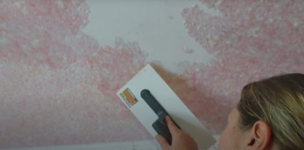 - Мастерком жидкие шпалеры наносятся на потолок в любом месте.