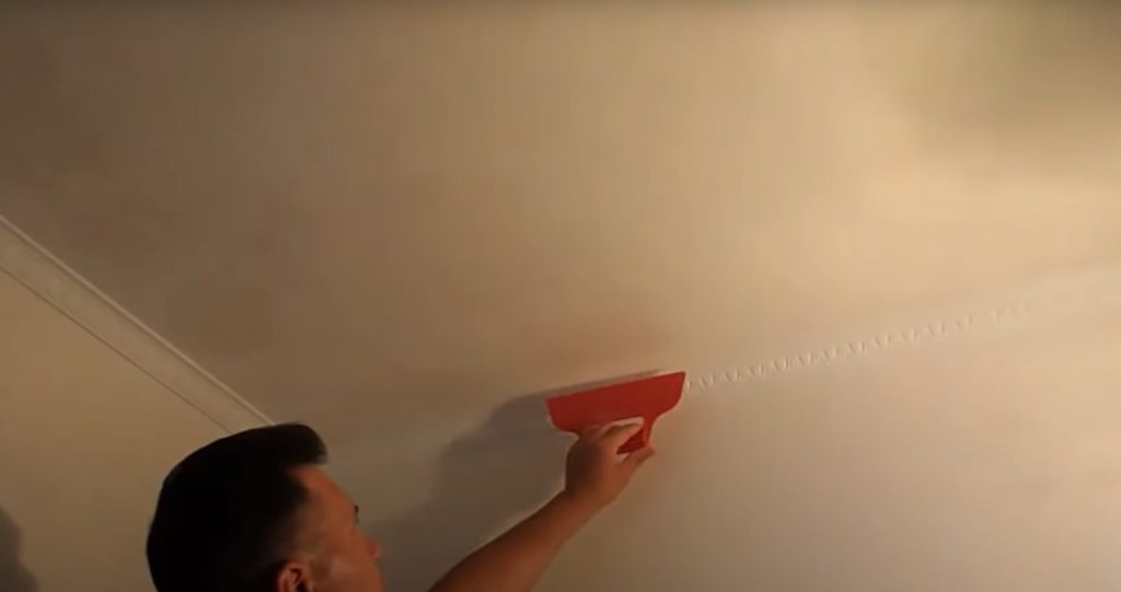 - Широким шпателем, лучше пластиковым, так как металл шпателя может при работе окислиться и оставить нежелательные пятна или разводы, нанесенная смесь равномерно распределяется по поверхности тонким слоем. Удобнее всего это делать, держа инструмент под углом в 20o по отношению к потолку.