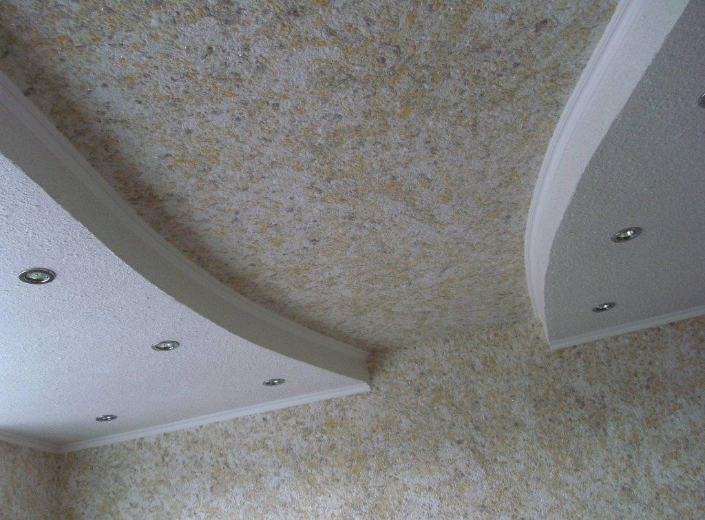 - Отделка потолка жидкими обоями из целлюлозы является бюджетным вариантом. Минимум декоративных добавок отразились на низкой цене.