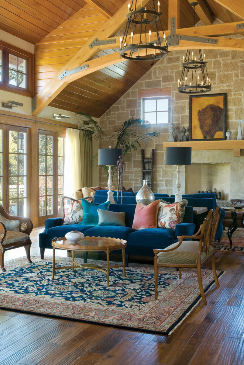 Глубокие оттенки синего и фиолетового в сочетании с золотым подойдут для просторной гостиной или столовой.
