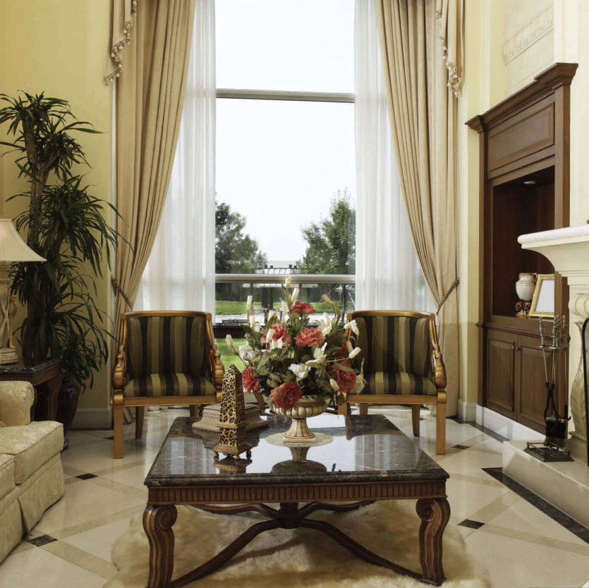 Золотые цвета в отделке гостиной помогают привнести в атмосферу помещения нотки роскоши и изяществаИсточник dhresource.com