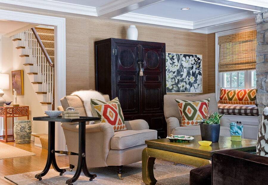 Если полотна на стенах декорированы классическими вензелями или пестреют обилием узоров, восточные подушки или светильники в стиле модерн будут выглядеть неуместно.