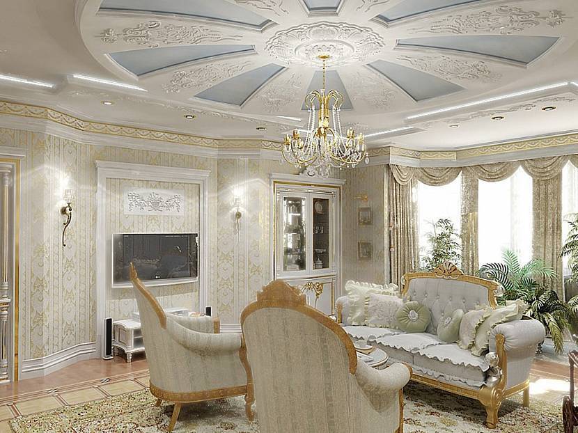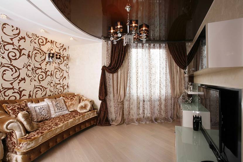 Перед тем, как заняться подбором занавесей к обоям золотого цвета, важно определиться со стилем оформления комнаты. Даже в жилом пространстве гостиные и залы остаются относительно «общественными» местами: здесь встречают гостей, людей, зашедших по делу, проводят время всей семьей, организуют различные мероприятия. Это позволяет проявить в интерьере нотки торжественности, роскоши, чему в наибольшей мере способствует привнесение золотистых оттенков