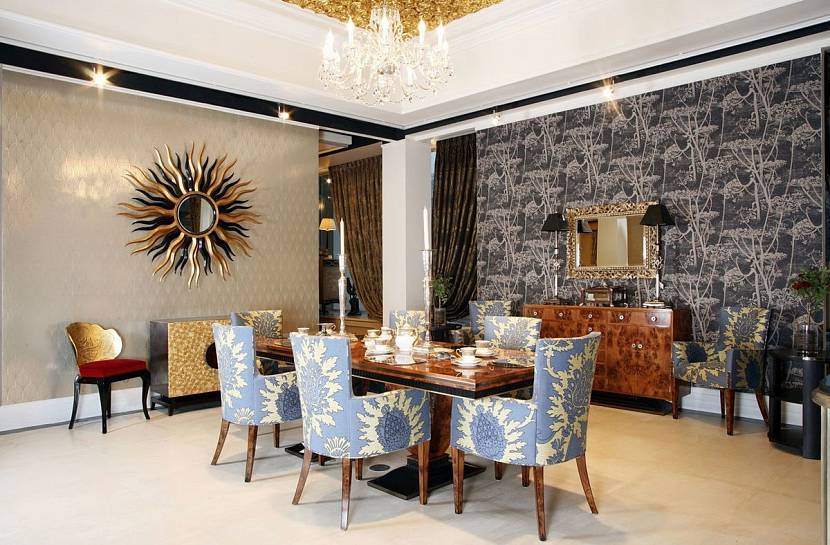 Глубокие оттенки синего и фиолетового в сочетании с золотым подойдут для просторной гостиной или столовой.