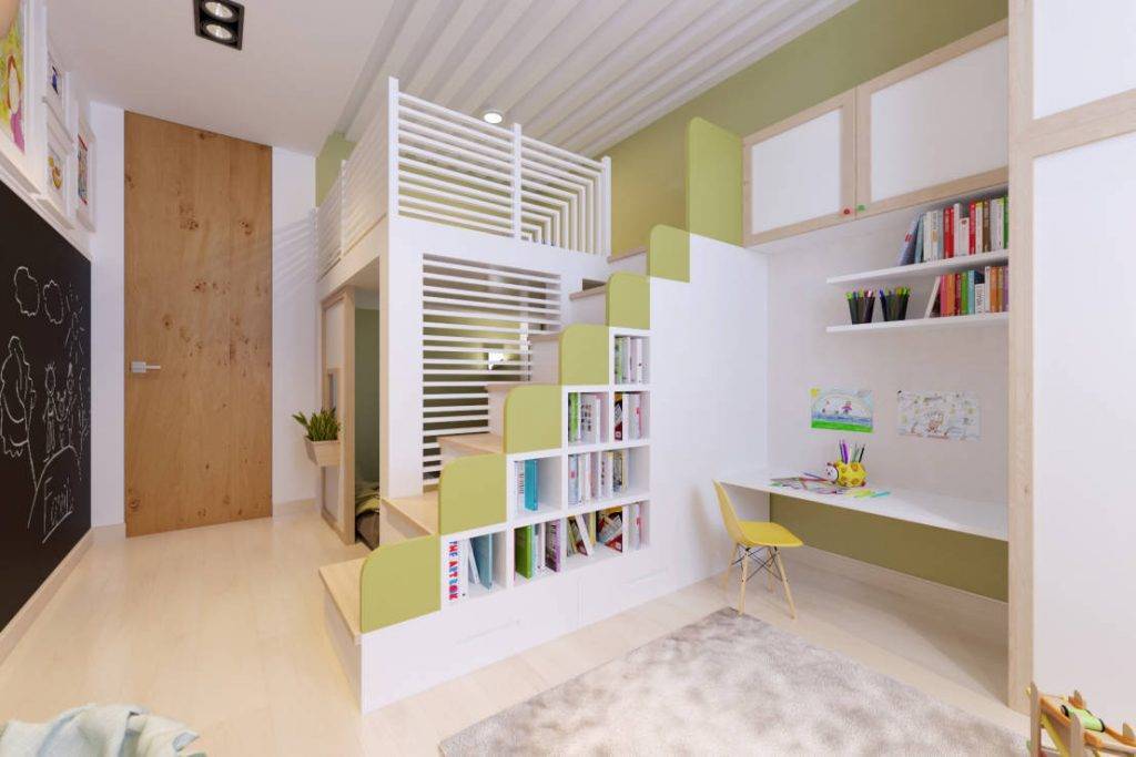 В детской зоне нужно установить шкафы, полки, позволяющие разместить все эти предметы. Помощь в обустройстве окажет мебель. К примеру, в детской в однокомнатной квартире можно установить кровать-чердак, обеспечивающую условия для сна, игр.