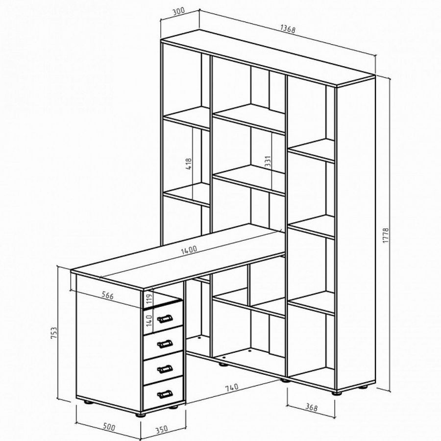 Габариты стеллажа – 1368 мм х 1778 мм х 300 мм. Размеры столешницы – 1400 мм х 566 мм. При своих относительно небольших габаритах стол-стеллаж имеет много места как для работы, так и для хранения.