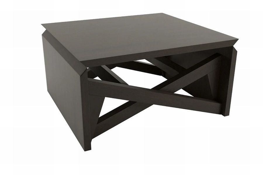 Небольшой журнальный столик имеет х-образную форму ножек за счет которых достигается высокая устойчивость. Система столешницы выполнена таким образом, что она легко складывается и раскладывается.