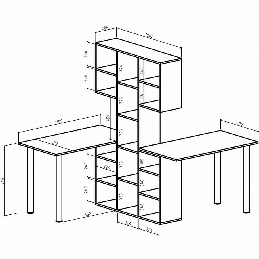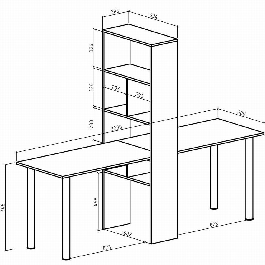 Стол- стеллаж с двойным стеллажом, места для хранения в два раза больше. Габариты стеллажа 1726 мм х 634 мм х 286 мм. Размеры столешницы 1100 мм х 600 мм. Габариты второго стеллажа – 746 мм х 550 мм х 170 мм.