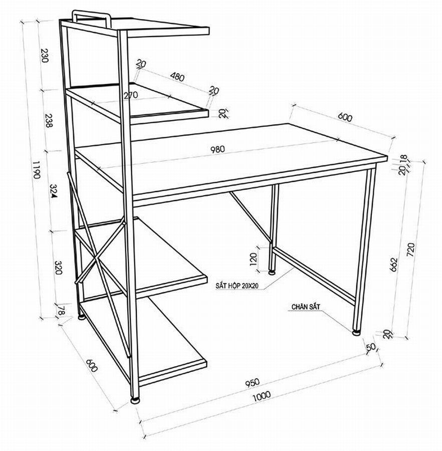 Стол-стеллаж где использовано пространство как над столешницей, так и под ней. Столешница имеет размеры 600 мм х 980 мм, таким образом стеллажи не будут мешать работе.