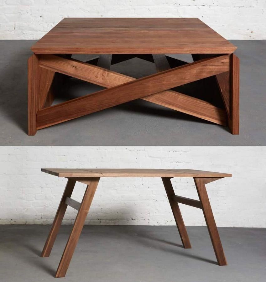 Бывают столы, которые имеют несколько форм, у такой мебели конструкция спроектирована так, что при трансформации ножки складываются друг к другу.