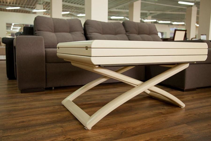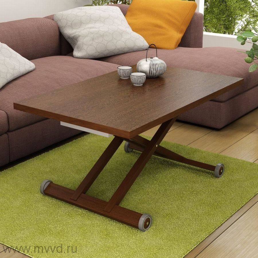 Небольшой журнальный столик имеет необычной формы ножки. Такая их форма позволяет столику не терять равновесия в разложенном виде.